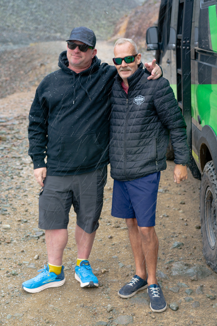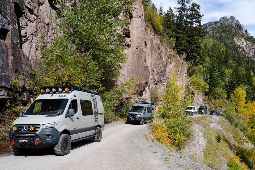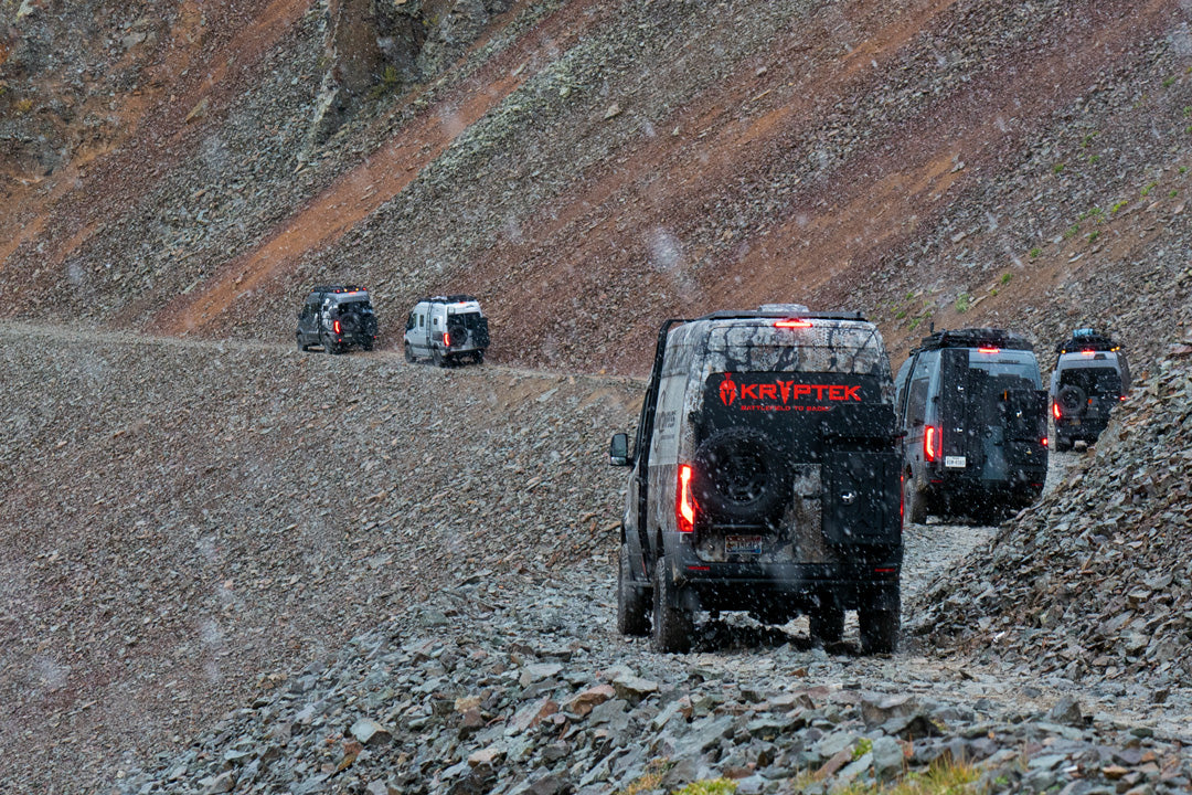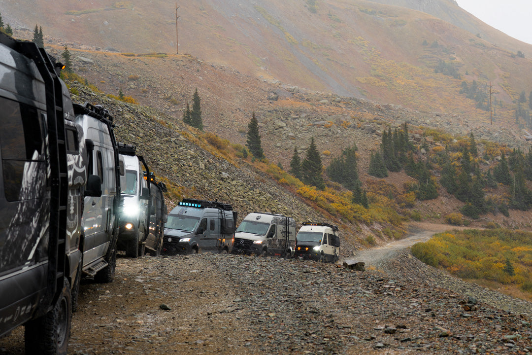 One might even say doing this pass in 4 motorhomes is a dangerous, stupid, irresponsible, and foolish idea. Undeterred by this consideration, we trudged onward and upward, keeping our vehicle's limitations in mind. One thing we all noticed is that around 12000 ft, the vans all felt very down on power. The onboard traction and power system safety nannies were clearly not happy with our decision, even stalling out on the most technical obstacles, which meant we were pulling cable. While trying to balance content creation, navigating the tricky parts of the trail, and the flow of traffic, we'd definitely burned more daylight than intended to get to this point.