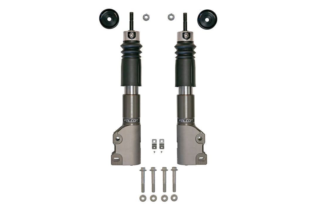 The pinnacle of suspension performance is being shifted to a new apex with our new inverted front struts, co-developed with Falcon. Not content with the mediocre performance, lack of tuning ability, and hit or miss service life of existing strut options, we looked outside our space to the world of motorsports for inspiration on how to solve this complex problem. Our all new, inverted damper strut is designed exactly to our fitment and tuning specifications and produced from aerospace grade materials. Inverted dampers flip the idea of the conventional strut upside down, and use the damper body as the upper strut shaft, while the load bearing unit contained in a massive lower housing that connects to the steering knuckle. This is the same application of technologies you will find on Dakar and World Rally Championship cars, which see some of the harshest driving conditions imaginable.